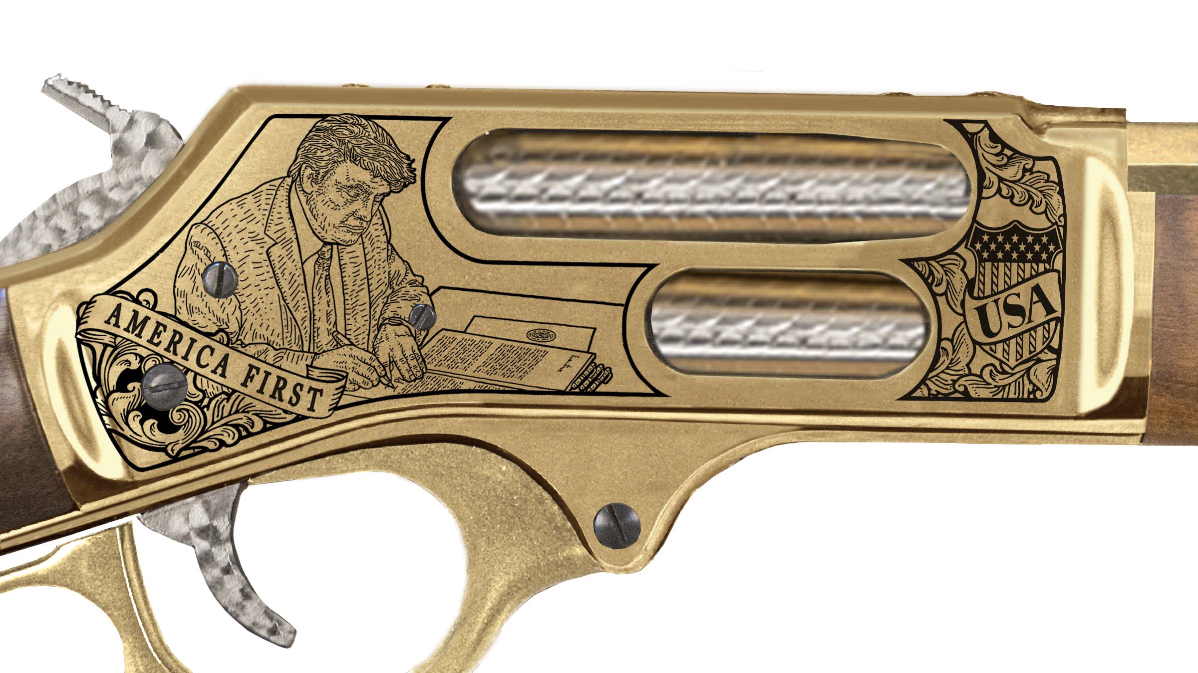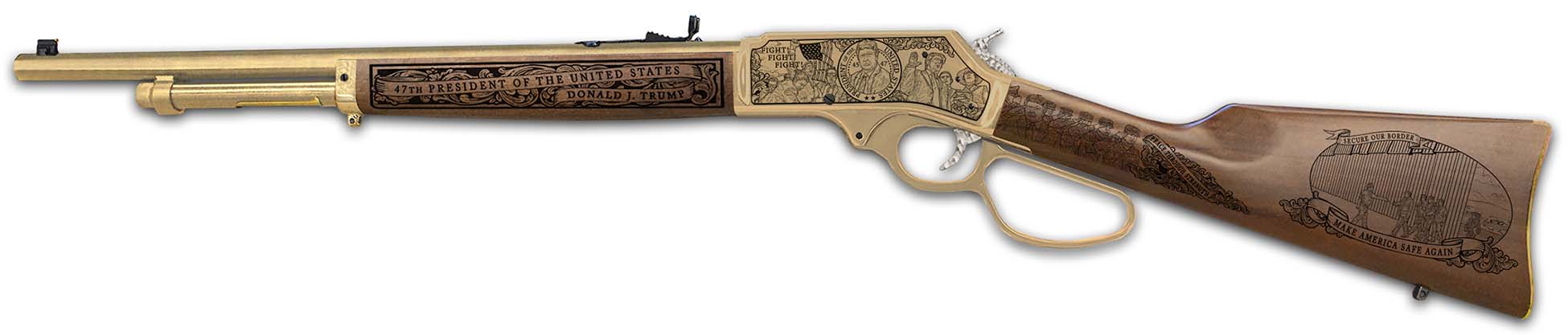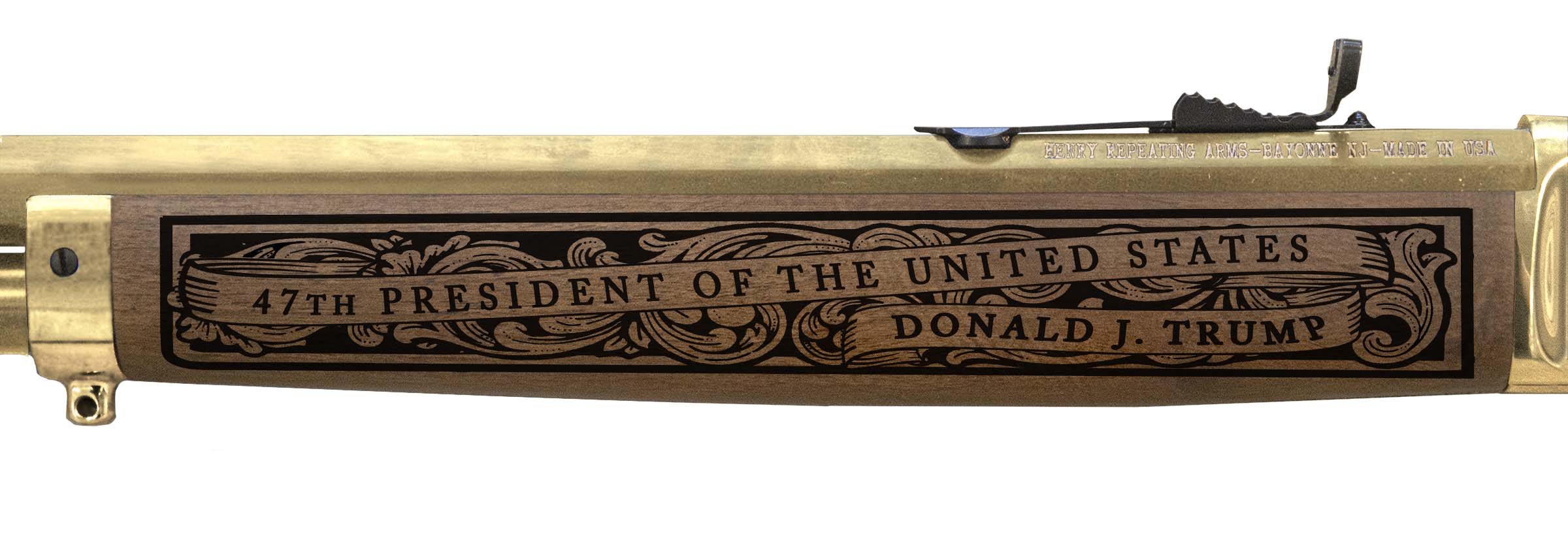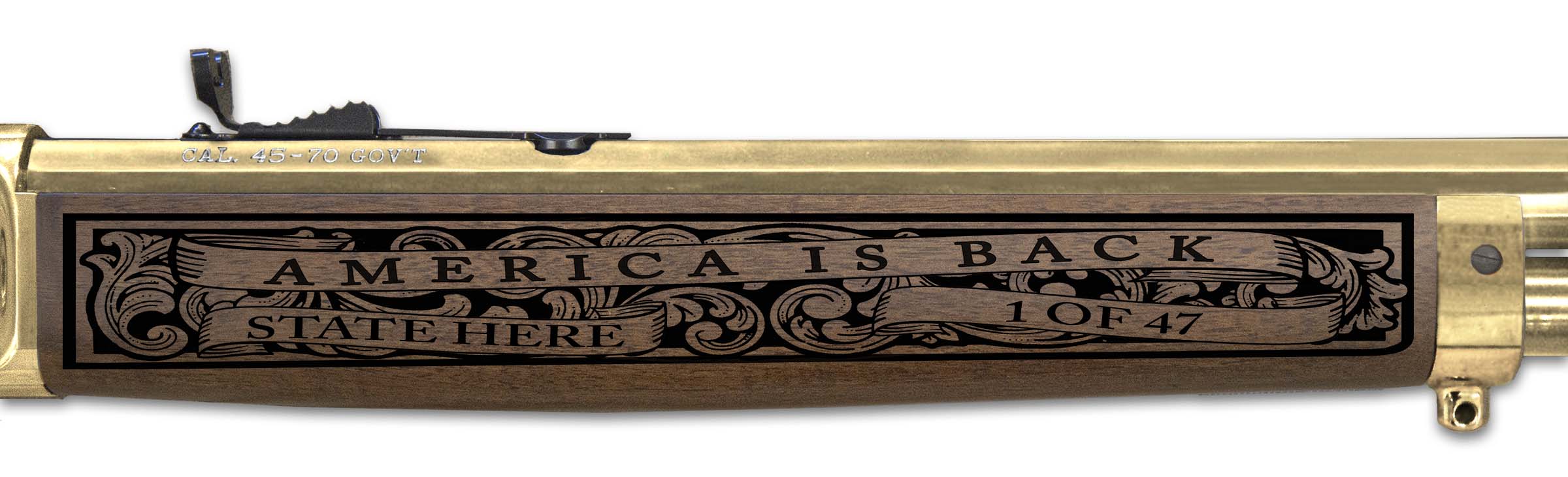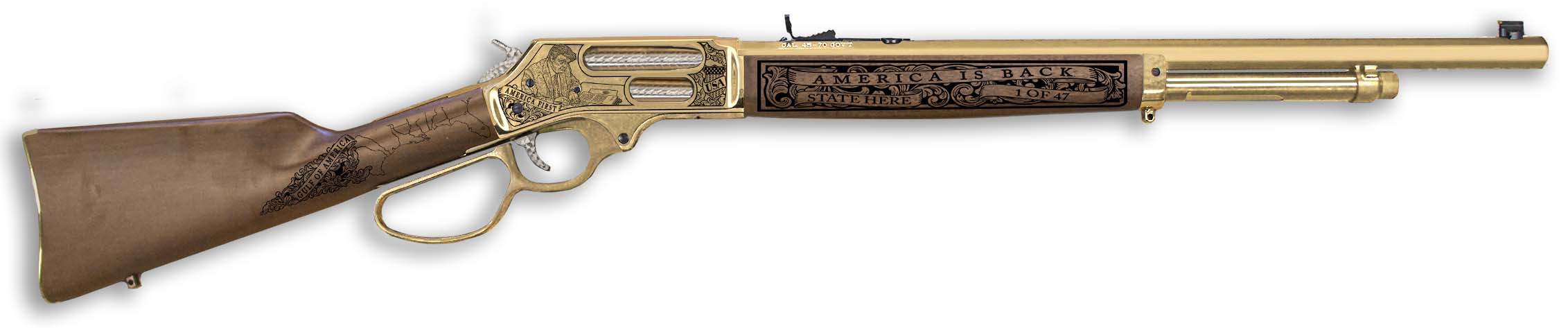 Presented on a Henry Lever Action- chambered in .45-70 Government, this rifle features a pristine 24-karat gold-plated finish & ornately engraved artwork on the receiver and walnut stock. Limited to 47 rifles per state, this edition is the perfect gift to commemorate Trumps presidency and continue your legacy!