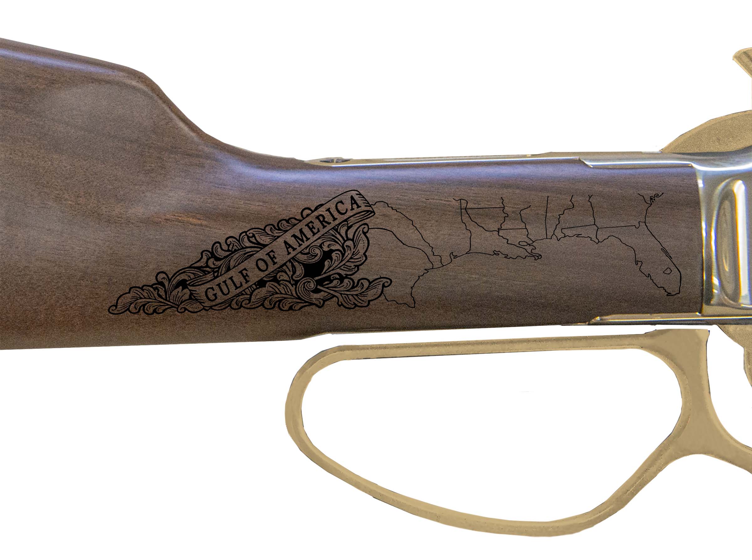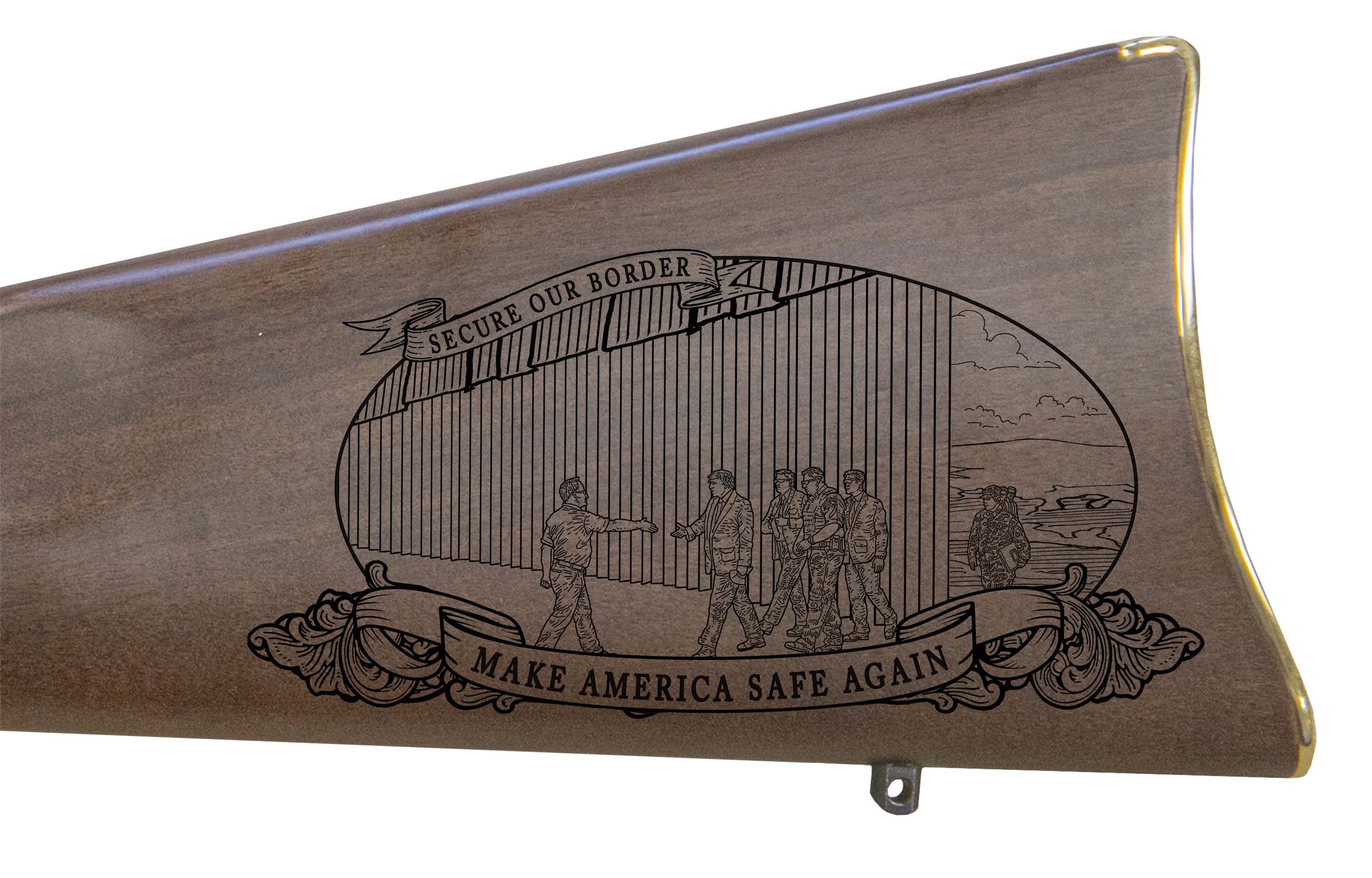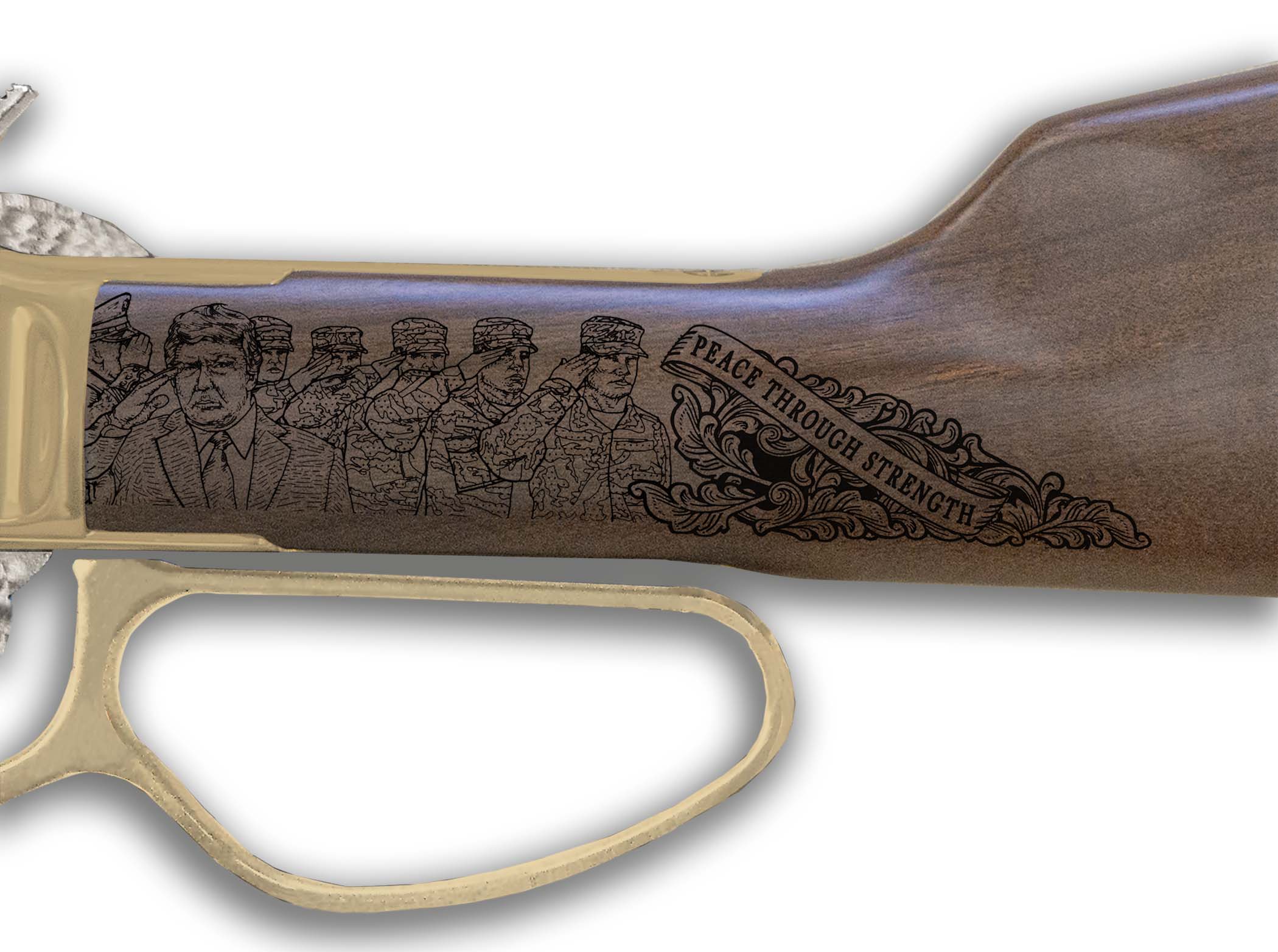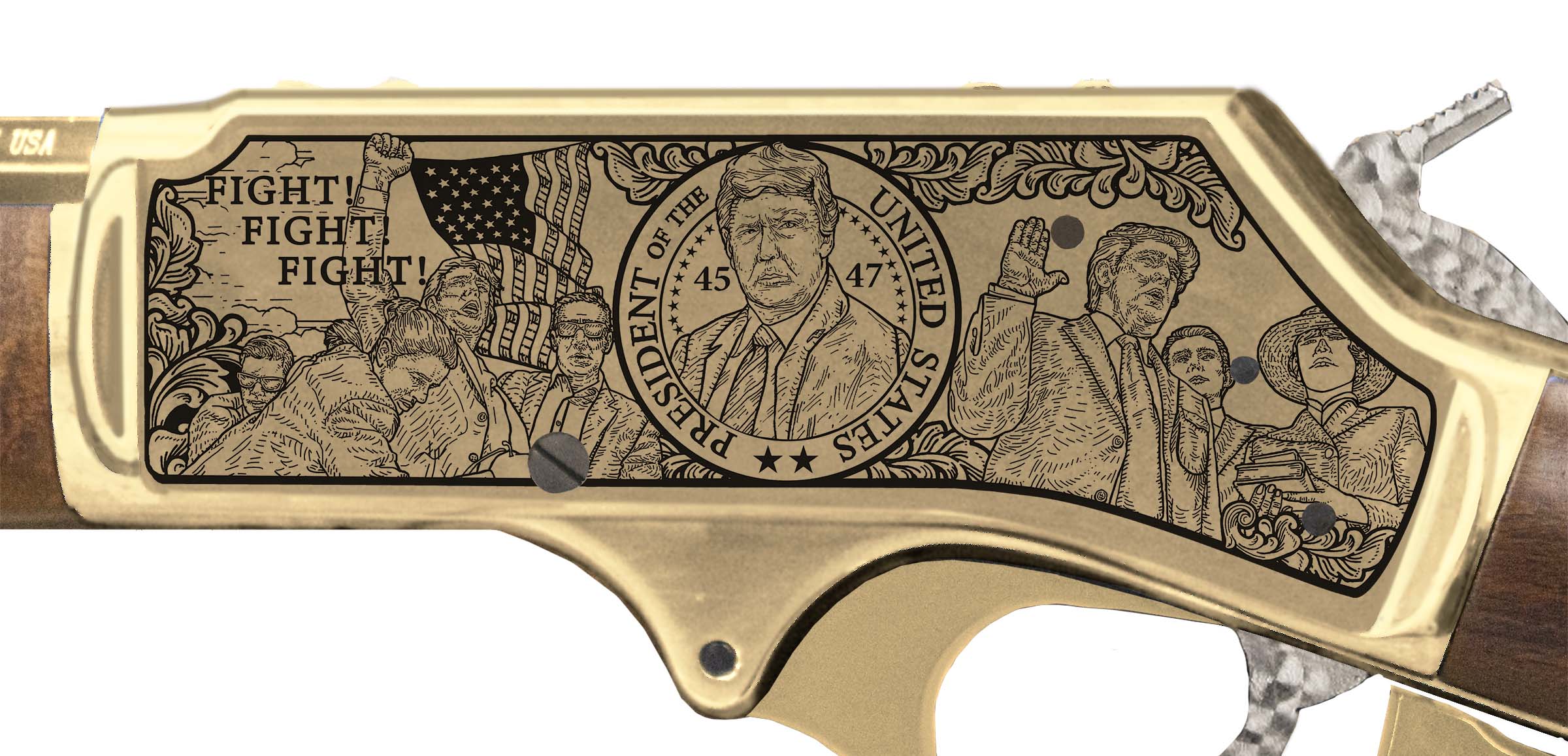 Presented on a Henry Lever Action- chambered in .45-70 Government, this rifle features a pristine 24-karat gold-plated finish & ornately engraved artwork on the receiver and walnut stock. Limited to 47 rifles per state, this edition is the perfect gift to commemorate Trumps presidency and continue your legacy!